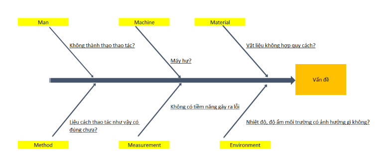 Nguyên nhân giả thuyết của vấn đề bao gồm 5M1E, Man, Machine, Material, Method, Measurement và Environment.